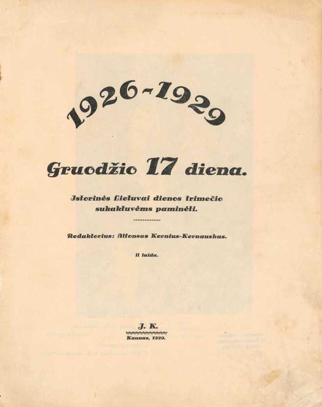 1926 – 1929 gruodžio 17 diena : istorinės Lietuvai dienos trimečio sukaktuvėms paminėti. Kaunas: F. Sokolovskienės ir G. Lano sp., 1929, P. 52)
